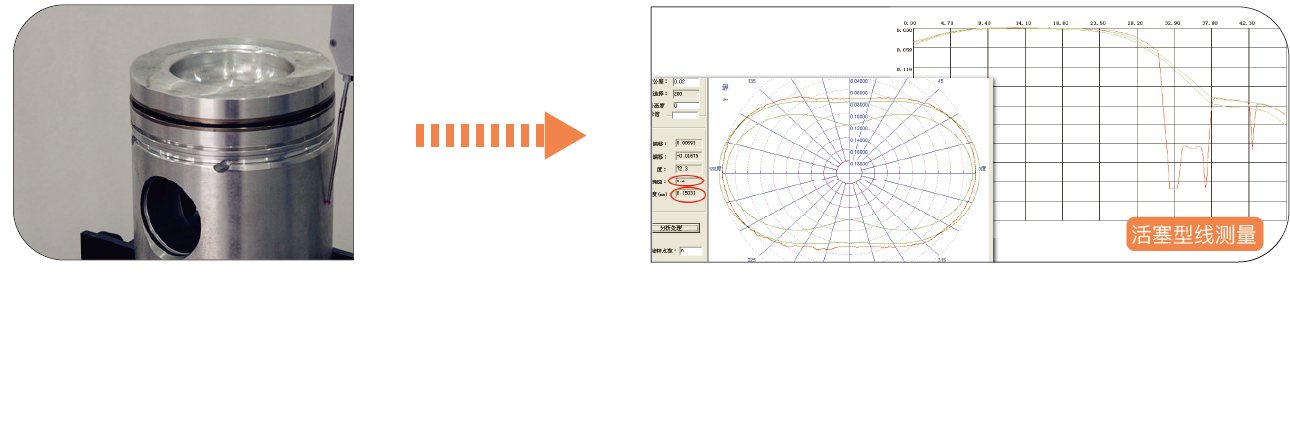 ● Piston profile measurement and elliptic section measurement software package to measure piston section lift, profile curve and ellipticity